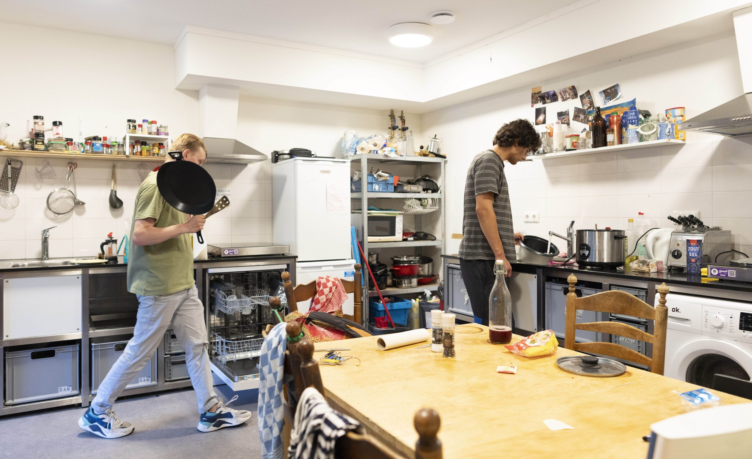 UTRECHT - Studenten in hun gedeelde woning in Utrecht. Nederlandse studenten gaan steeds minder vaak op kamers. Ze kiezen er vaker voor om bij hun ouders te blijven wonen. Dat komt door een tekort aan huisvesting, er zijn simpelweg geen kamers beschikbaar om in te gaan wonen. En als die kamers er wel zijn, zijn ze vaak niet betaalbaar. Ook het leenstelsel speelt een rol bij hun beslissing. ANP FREEK VAN DEN BERGH