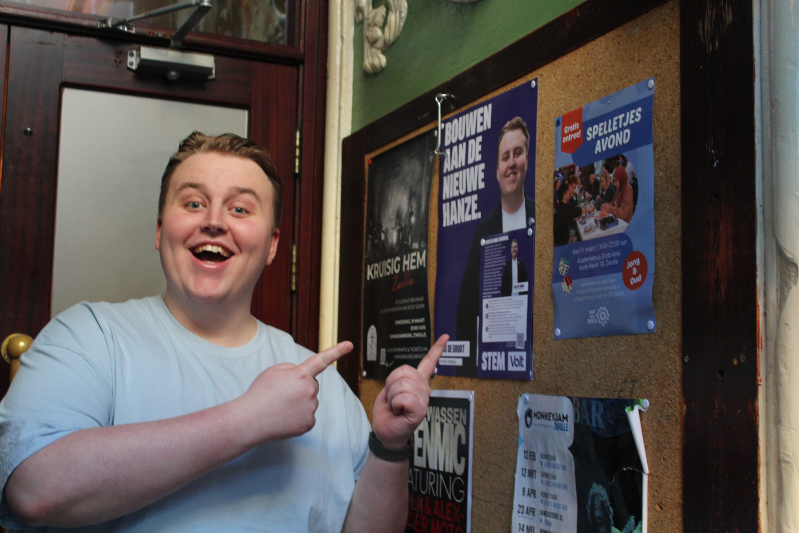 Bas de Groot is 23 jaar en nu al heeft hij kans om in de gemeenteraad van Zwolle te komen. Hij staat namelijk op plek drie van de lijst van Volt Zwolle. De partij heeft een streven van drie zetels, dus hij heeft er vertrouwen in. De Groot zet zich in voor jongeren en om van Zwolle een echte studentenstad te maken. De liefde van Zwolle is begonnen in Studentencafé Het Vliegende Paard, daarom spreken we daar ook af.